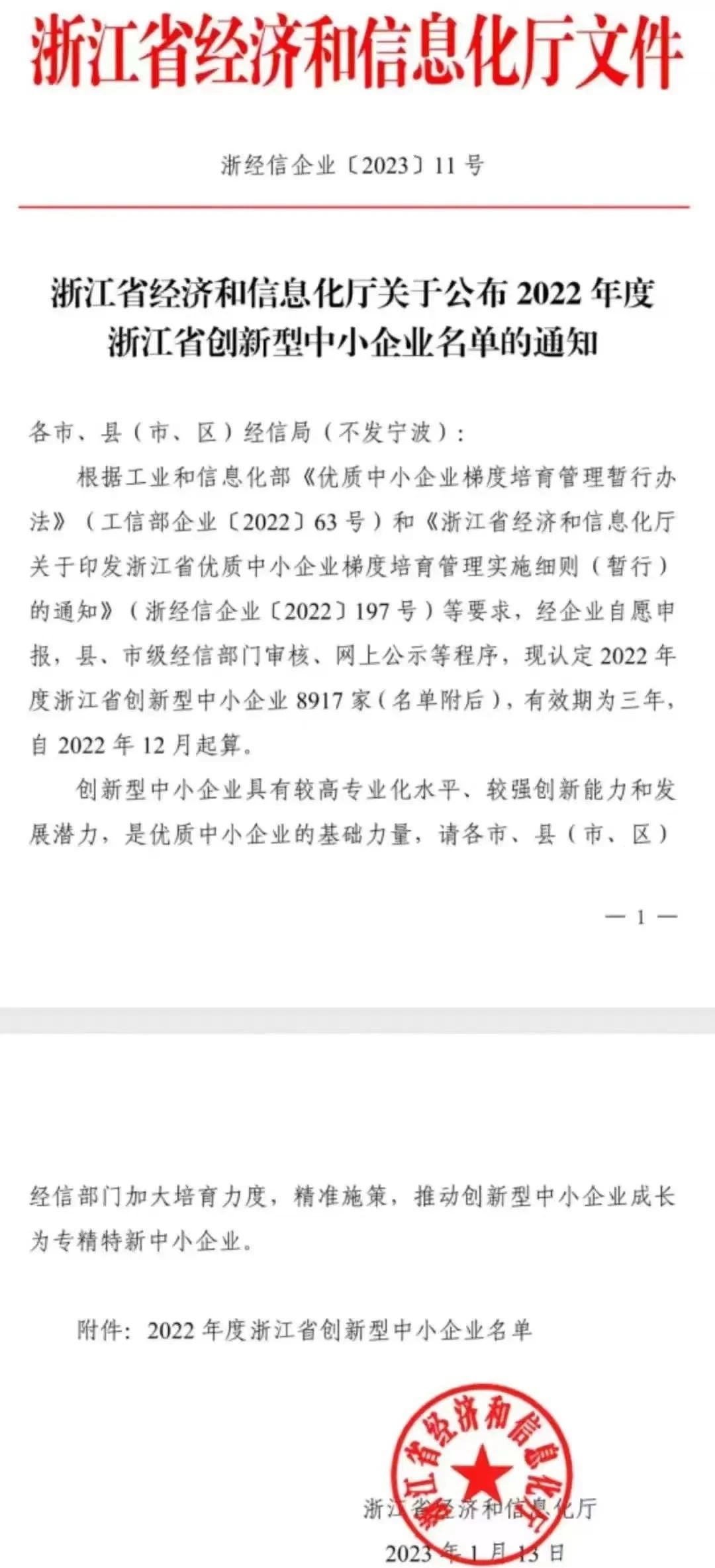 近日,浙江省經(jīng)濟(jì)和信息化廳公布了“2022年度浙江省創(chuàng)新型中小企業(yè)”名單,經(jīng)過公開申報(bào)、經(jīng)濟(jì)和信息化主管部門初審?fù)扑]、專家評(píng)審、網(wǎng)上公示等極為嚴(yán)格的評(píng)審標(biāo)準(zhǔn)等程序。