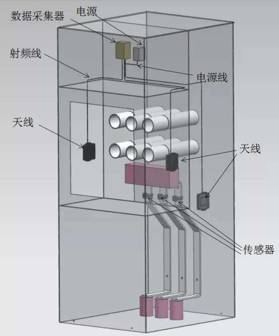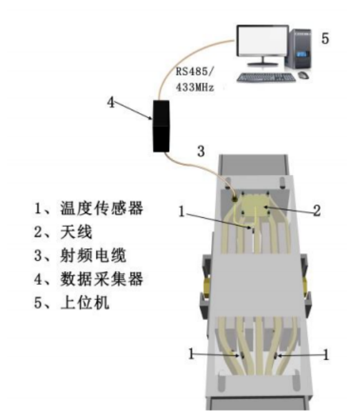 天線再通過射頻電纜將數(shù)據(jù)傳輸?shù)綌?shù)據(jù)采集器/溫度監(jiān)控主機,再由數(shù)據(jù)采集器/溫度監(jiān)控主機對數(shù)據(jù)進行處理并通過RS485或433MHz無線信號發(fā)往上位機。